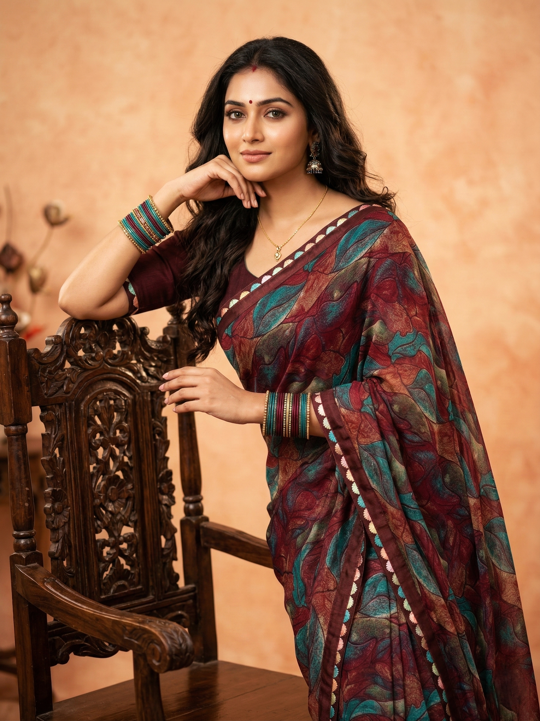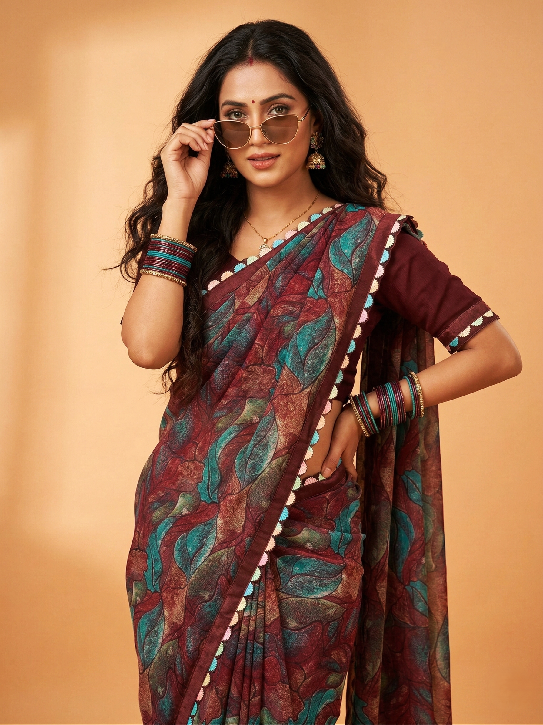 • Eye-catching maroon saree with vibrant teal leaf-inspired prints