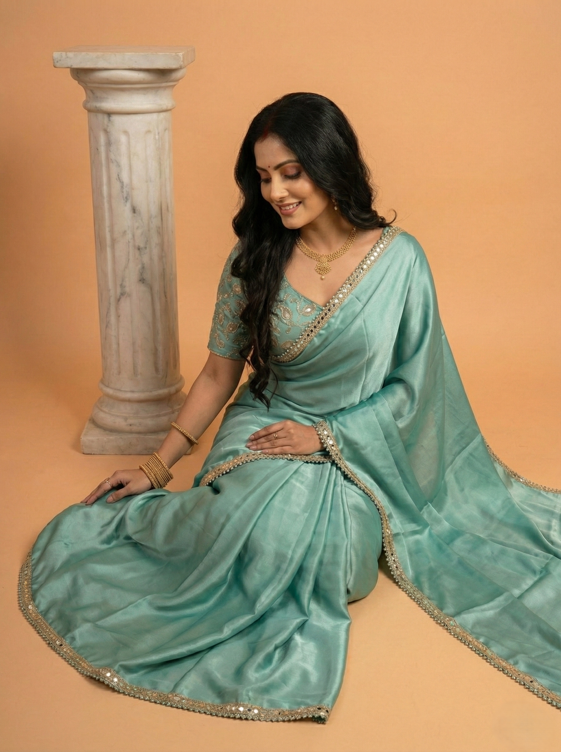 Mint Green Satin Silk Designer Saree